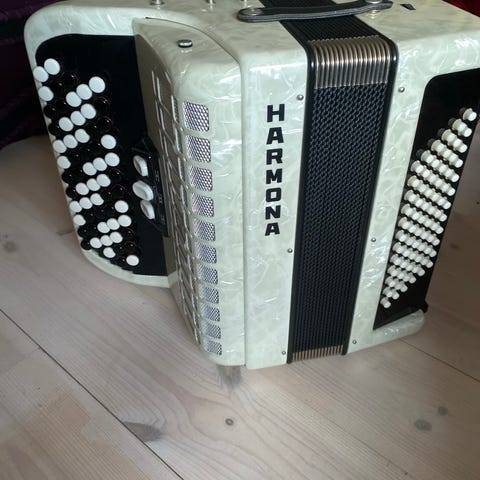 Harmonika i ukendt mærke i rød perlemorsfinish. Instrumentet har pianotangenter i hvid og sort samt bas-/akkompagnementsknapper i siden. Bælgen er lys med kontrastfarvede kanter. Der er bærestropper monteret på bagsiden, så harmonikaen kan spilles stående eller siddende. Velegnet som instrument til øvning, undervisning eller som ekstra harmonika. Antal tangenter og registre fremgår ikke præcist af billederne.