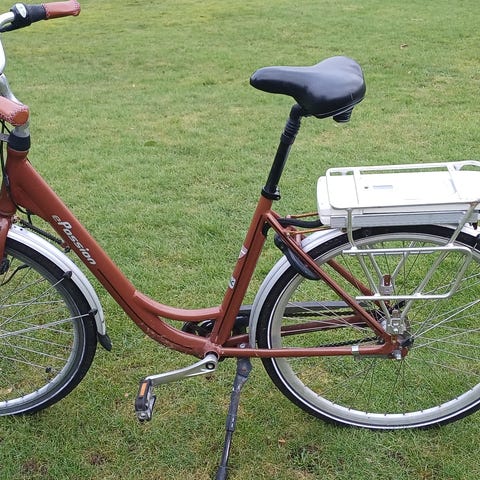 Elvira madigan fra cykelland elektrisk damecykel i størrelse XL med 28" hjul. Cyklen har lav indstigning og er udstyret med el-motor og batteri placeret på bagagebæreren. Stellet er hvidt med sort udstyr og brun sadel og håndtag. Foran er der monteret cykelkurv. Egnet til kvinder, der ønsker en elcykel til daglig transport og bykørsel.Batteri defekt