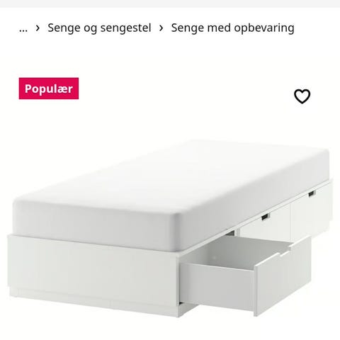 IKEA NORDLI sengestel med opbevaring i hvid til madrasmål 90x200 cm. Sengen har integrerede skuffer under liggefladen, som giver ekstra opbevaringsplads til f.eks. sengetøj eller tøj. Designet er enkelt med glatte, hvide flader og lav gavl. Velegnet til enkeltseng i soveværelse, gæsteværelse eller børneværelse, hvor der er behov for både soveplads og opbevaring i ét møbel. Jeg har 2 stk, prisen er pr. Stk
