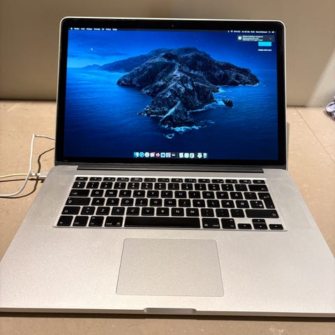 Superfin og 100% velfungerende Apple MacBook Pro Retina 15-inch Mid 2015 computer med 16 GB ram, 250 GB Flash SSD-harddisk, hurtig Intel Quad-Core i7 CPU på 2.2 GHz.
