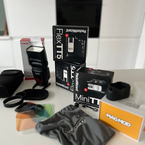 Komplet professionelt Canon flash-setup sælges. Perfekt til portræt-, event-, studie- eller off-camera flashfotografi.