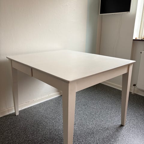 Smukt hvidt IKEA spisebord med udtræk maximum længde 180 cm minimum længde 120 cm bredde 80 cm højde 74 cm tillægsplade kan gemmes væk under Bordpladen se billeder fremstår rent og pænt og stærkt og funktionelt og jeg kan måske hjælpe medlevering