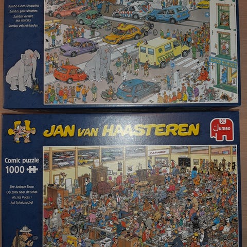 Jumbo Jan van Haasteren 3-i-1 puslespilsæt med fodboldtema.: Tre forskellige puslespil med henholdsvis 500, 750 og 1000 brikker. Football 2006 World Championship. Puslespilsmotiverne følger også med som plakater.: 150 kr