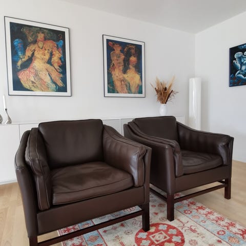 Sæt eller enkeltvis - 2 lænestole i sort læder. Stolene har en firkantet, kompakt form med brede armlæn og løse sædehynder. Ben i metal giver et enkelt og moderne udtryk. Egnet til stue, kontor eller opholdsrum, hvor der ønskes komfortable siddepladser i et neutralt design.