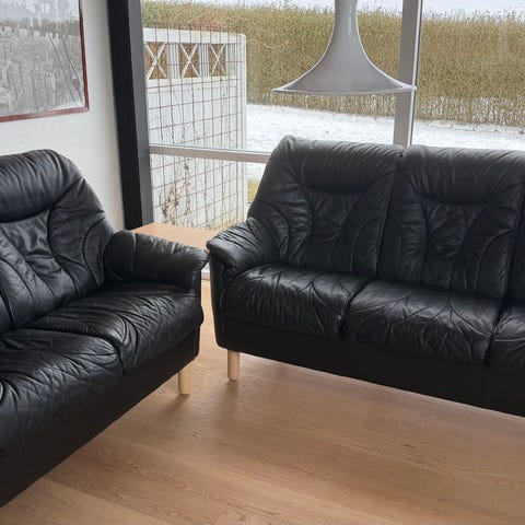2 stk lædersofaer 2 og 3 personers samt tilhørende sofabord. Sælges samlet eller opdelt, pris samlet 4000,- delepriser 2 personers 2000,- 3 personers 3000,- sofabord 500,-