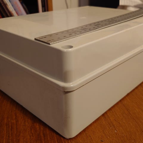 Skråpult kabinetter - 24cm x 18cm x 10cm (hvor de er højest). Mellemgrå ABS.