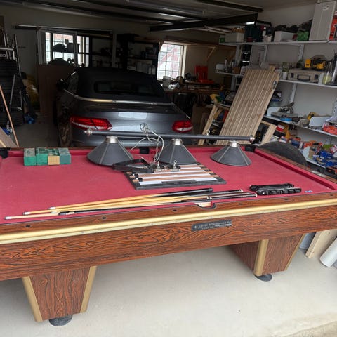 Søren Søndergaard poolbord med grøn filt og bordplade i kraftig kvalitet. Bordet har træfinish på sider og ben, samt klassisk hulinddeling til pool. På billederne ses tilbehør som køer, ball-triangle og poolkugler, som indgå afhængigt af sælgers oplysninger. Velegnet til indendørs brug i hjem, kontor eller fællesrum, hvor der ønskes et poolbord.