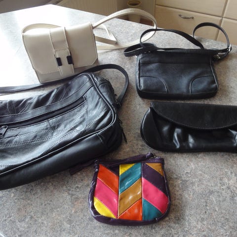 Kuverttasker lavet af papir/kaffeposer beklædt med tyndt plastic. De er med lynlås.