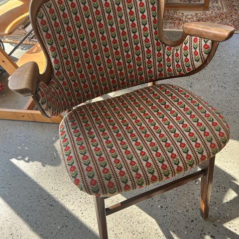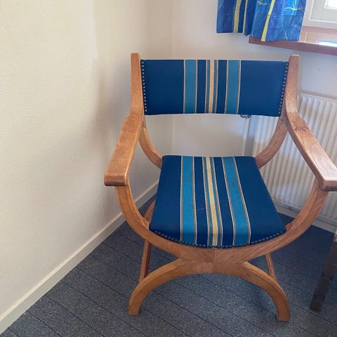 Flot sort lakeret gammel stol - med stribet betræk- har kun stået til pynt.