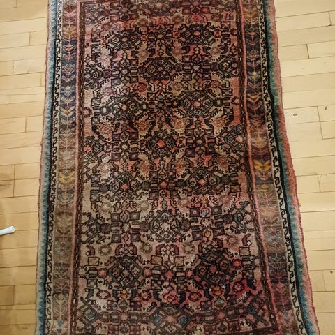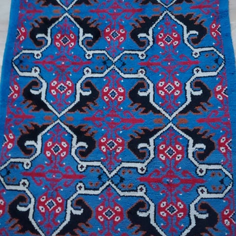 Tæppe med orientalsk inspireret mønster i rektangulær form. Lys bundfarve med mørkere, detaljeret mønster i midter- og kantfelter. Velegnet som gulvtæppe i stue, gang eller soveværelse. Materiale: uld.