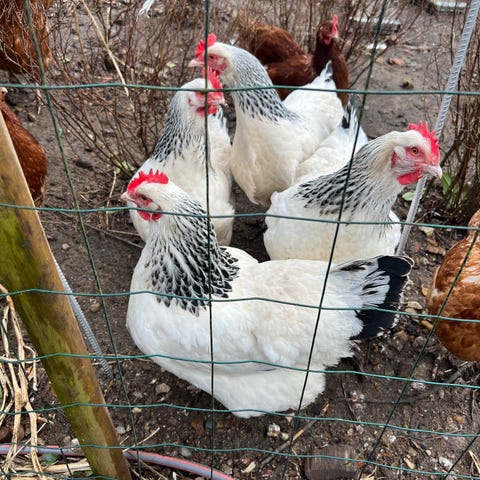 Blandede racer høns i forskellige farver. Velegnet til hønsegård eller mindre landbrug. Hønsene går i stald med strøelse på gulvet. Flere dyr ses på billederne, herunder både brune, sorte og stribede høns.