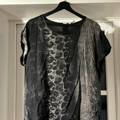 Soyaconcept top til kvinder i størrelse M. Toppen er i viskose og har sort stribet mønster på lys bund. Den har korte ærmer, v-udskæring med lille stolpelukning og let, løs pasform. Velegnet til hverdagsbrug eller kontorbrug, og kan kombineres med både bukser og nederdel.