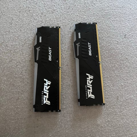 Sættet består af to DDR4 RAM-moduler på 8GB hver, i alt 16GB. Modellerne er fra Kingston Fury-serien, Beast-varianten, med sort heatspreader. Standard DDR4 DIMM til stationære computere.