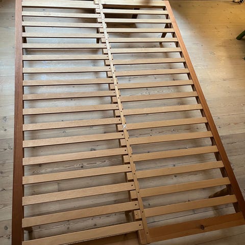 IKEA daybed i lyst fyrretræ med udtræksseng. Sengen består af en træramme med plads til to enkeltmadrasser, hvor den nederste del kan trækkes ud som ekstra soveplads. Designet gør det muligt at bruge sengen både som enkeltseng og som dobbeltseng, afhængigt af behov. Egnet til brug i gæsteværelse, børneværelse eller mindre rum, hvor der er behov for fleksibel soveplads - single, double, 2 singles