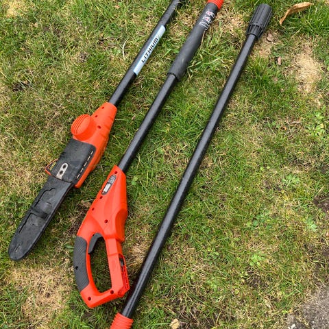 Den har et teleskopskaft, der kan forlænges for at nå høje grene.