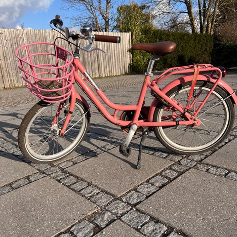 Børnecykel med 20" hjul i mintgrøn farve. Cyklen har lav indstigning, bagagebærer og fastmonteret kædeskærm. Der er monteret kurv foran samt støtteben. Sadlen er brun og højdejusterbar, og styret kan ligeledes justeres, så cyklen kan tilpasses barnets højde. Velegnet som hverdagscykel til børn i skole- og fritidsbrug.