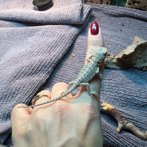 Der medfølger fatning og pære med uv lys diverse invandrer i terrariet samt lidt vitaminer og kakerlakker.