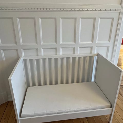 IKEA tremmeseng i hvidt trælook. Under sengen er der integrerede skuffer til opbevaring. Brugt men i god stand. Kan afhentes på Amager.