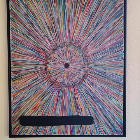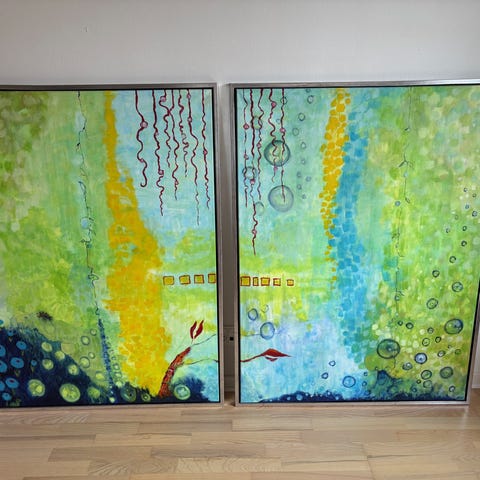 Abstrakt kunst sæt bestående af to malerier og en rund vase i flerfarvet, geometrisk motiv med ansigter. Malerierne er rektangulære og viser stiliserede portrætter i klare farver opdelt i felter. Vasen har tilsvarende grafisk mønster med cirkler og ansigtselementer. Egnet som vægdekoration og interiørpynt i stue, kontor eller andre opholdsrum, hvor der ønskes et farverigt, moderne udtryk.