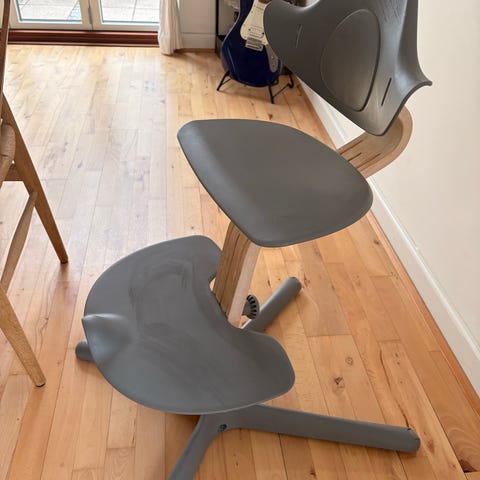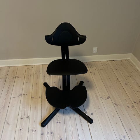 Stokke Clikk højstol i grå. Højstolen har aftagelig bakke og fodstøtte. Puden, sele og pose følger med (ekstra udstyr). Egnet til småbørn, der kan sidde selv, og kan bruges ved spisebord eller som selvstændig stol med bakken monteret.