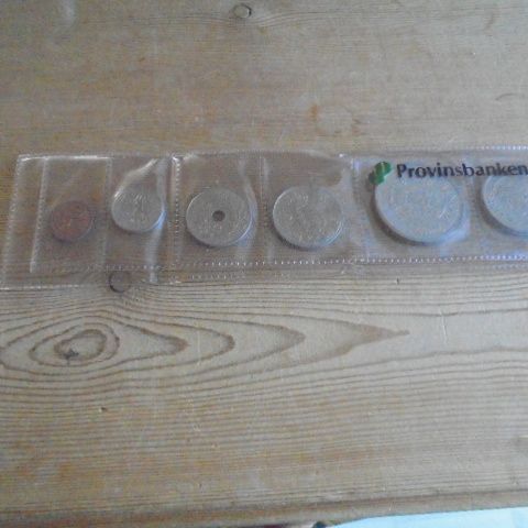 5 øre, 10 øre, 25 øre, 1 krone, 5 kroner, 10 kroner.