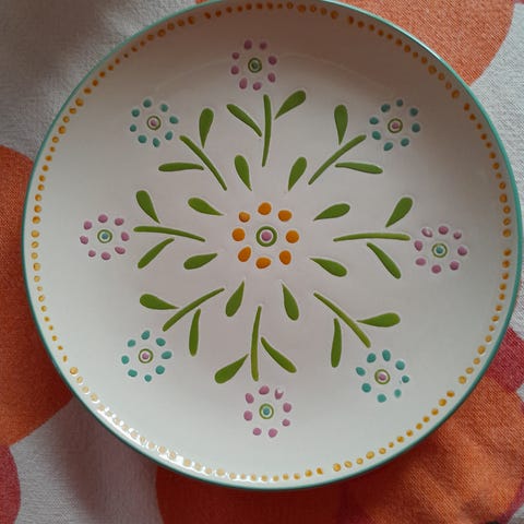 Keramik, tallerkener, Smooth Sailing, Håndmalet af Sally Huss - en kendt kunstner fra USA. Ingen skår. Et skønt farverigt sommersæt til hjemme eller sommerhuset.