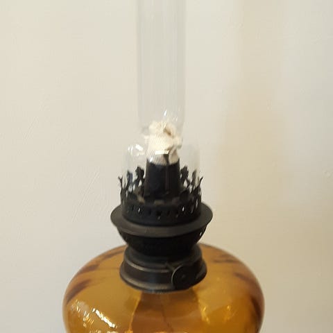 Olielampe, Gammel som ny, petroleums-/olielampe m/tin fod. Vintage