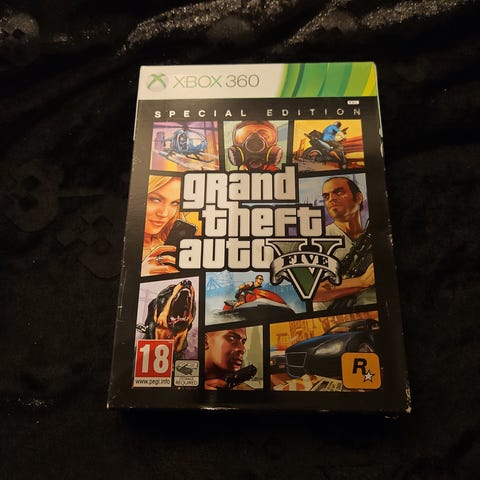 Rockstar Games Grand Theft Auto V Special Edition Xbox 360 spil. Udgaven er til Xbox 360 og inkluderer spil på disk. Cover og indhold fremgår af billederne, herunder special edition-indpakning og flere diske. Samt blueprint kortet der kan vise skjulte ting i uv lys.. Spillet er PEGI 18-mærket og beregnet til voksne spillere. Velegnet til brug på Xbox 360-konsoller, der understøtter fysiske spilmedier.