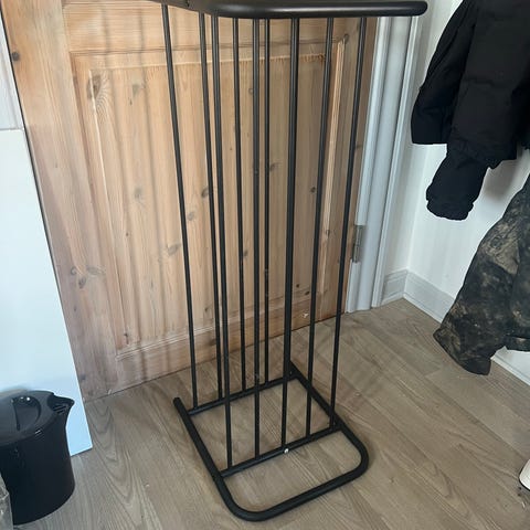 I stål. Har 4 hylder.