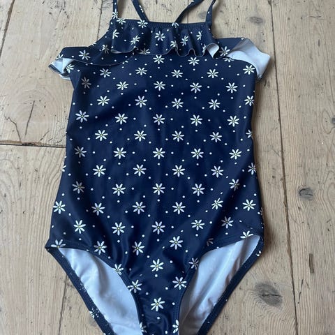 H&M badedragt til pige i str. 134/140. Badedragten er blå- og hvidstribet og er lavet i polyester. Modellen har asymmetrisk overdel med én skulderstrop og en bred flæsekant foran og bagpå.