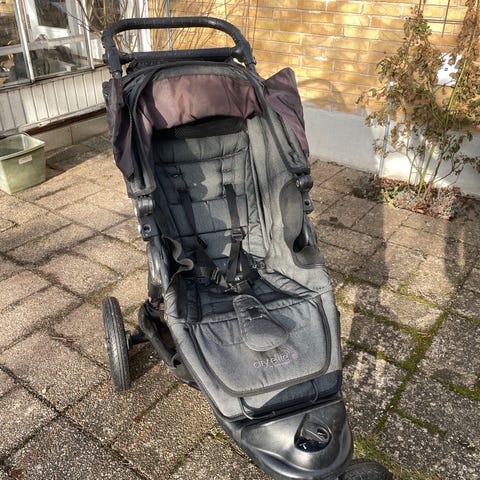 Baby Jogger, City Elite, klapvogn med tre velkørende hjul, der egner sig godt til både by og mere kuperet terræn. Vognen er tydeligt brugt, men kører godt og klapper nemt sammen.