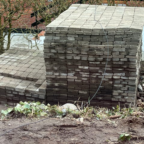 Belægningssten i grå beton egnet til indkørsel, gårdsplads og terrasse. Stenene er lagt i forbandt og fremstår som klassiske rektangulære fliser, der kan optages og genanvendes andre steder. Velegnet til områder med personbiltrafik, gangarealer eller som belægning omkring hus og have. Billederne viser nuværende belægning i indkørsel og gårdhave, så køber kan vurdere størrelse, form og udseende på stenene.