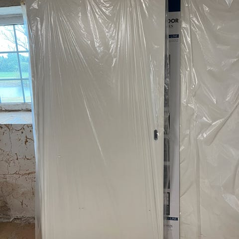 Skydedør i hvid farve. Egnet som port til lukning af udhus, hvor der ønskes en enkel, lys portløsning.