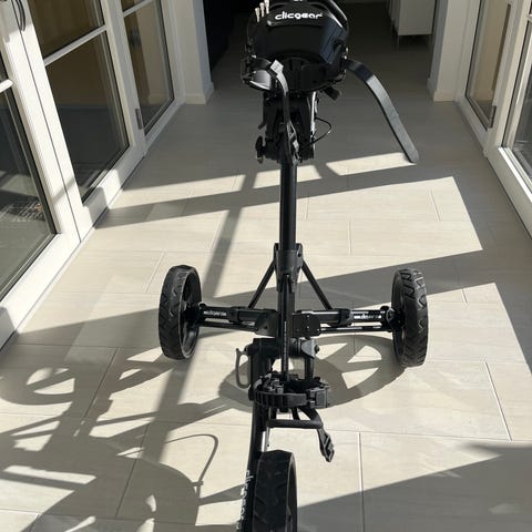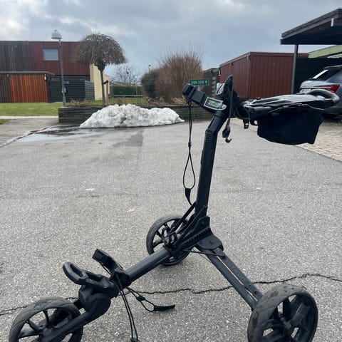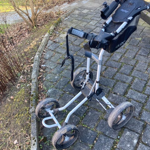 Golfvogn 4-hjulet sammenklappelig i grå. Vognen har fire store hjul, som giver stabilitet på ujævnt underlag. Den kan foldes kompakt sammen for nem opbevaring og transport. Håndtaget er udstyret med opbevaringsbakke med låg, kopholdere og plads til småting som fx bolde og tees. Der er desuden netkurv under konsollen til ekstra udstyr. Paraplyholder inkluderet og monteres i håndtaget.
