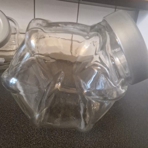 1 stort rundt glas med flade sider, højde 18 cm, åbning 10 cm, med plastik låg.