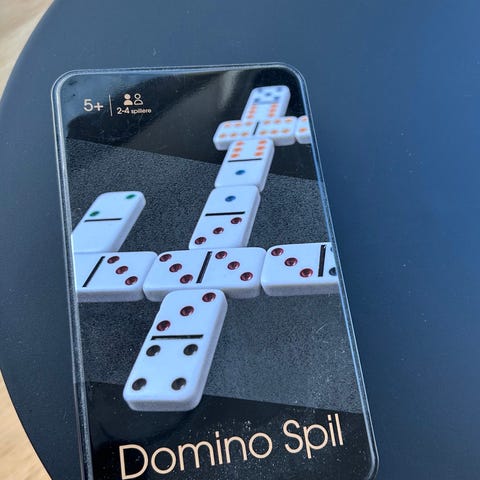 Domino spil i metalæske med instruktioner på nordiske sprog