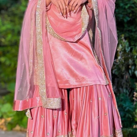 Et gennemsigtigt net-dupatta/ tørklæde med fint broderede kanter fuldender looket og tilfører dette smukke outfit et ekstra strejf af raffinement.