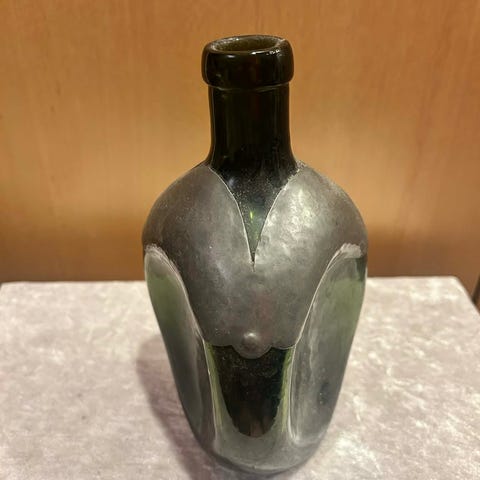 A small vintage inkwell: a square glass ink bottle with a faceted glass lid, mounted in a brass or bronze desk stand. Pieces like this were common in the late 19th to early 20th century.