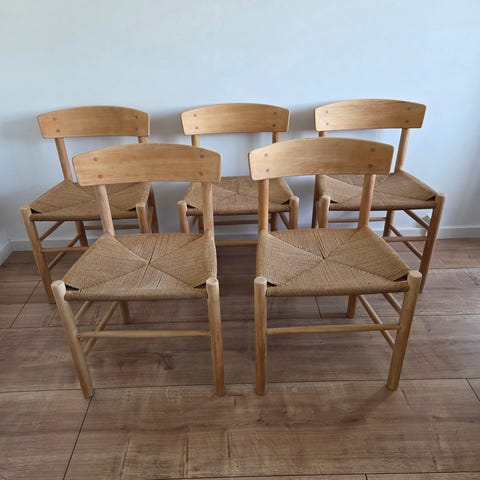 6 stk Børge Mogensen vintage J39 spisebordsstole i træ med fletsæde. Stolene har hvidmalet stel og ryglæn samt naturfarvet flettet sæde.