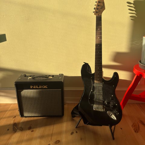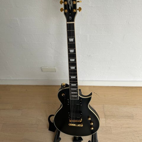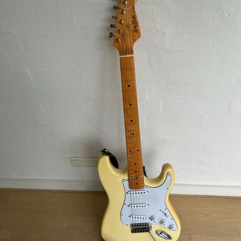 Elektrisk guitar i natur træfinish. Kroppen har synlig træstruktur, og guitaren er udstyret med to humbucker-pickupper, tremolo-bro og 6-strenget opsætning. Halsen har prik-indlæg på gribebrættet og stemmeskruer i kromfarve. Egnet til elektrisk guitarspil i forskellige genrer.Det er en Harley Benton med Floyd Rose tremolo og grovere mekanikker