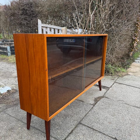 Flot vintage skænk i teaktræ med justerbare hylder. Fremstår i god stand med aldersrelaterede brugsspor. Skænken er fra midcentury og har justerbare hylder. Samme skænk haves også med glaslåger.