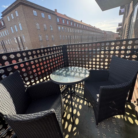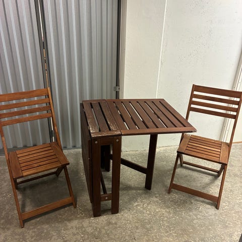 Altanmøbelsæt bestående af et rektangulært klapbord og to klapstole. Sættet er udført i grå flet-look med metalstel. Bord og stole kan klappes sammen for nem opbevaring og er velegnet til altan eller mindre udendørsarealer.