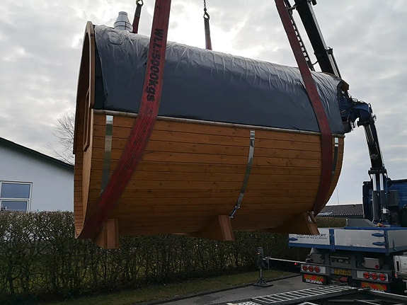 Saunaen leveres færdigbygget. Kunden står selv for aflæsning fra fragtbil.