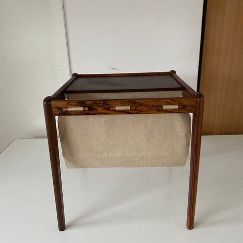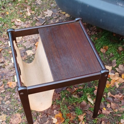 Vintage avisbord i træ med to hylder i brun finish. Reolen har lodrette tremmer i siderne og en åben konstruktion, der gør den egnet til opbevaring af bøger, magasiner eller dekoration. Hylderne er plane med let buet forkant på den nederste hylde. Overfladen viser almindelige brugsspor. Velegnet i både stue, entré eller soveværelse.