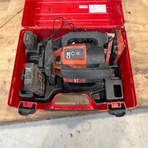 Fabrikat: Hilti Model: PR2-HS A12 Note: - Rotor laser Årgang: 2020 Drivmiddel: Batteri Transportmål (L x B x H) m: 0,7 x 0,6 x 0,3 Vægt kg ca.: 15 Vægt er estimeret og uforbindende: Ja Er visuelt gennemgået, men ikke testet fuldt ud i alle funktioner: Ja Har klistermærker med Sælgers navn: Er redigeret bort på foto Er eventuelt i drift frem til levering: Ja Visuel stand (1-5) 5=bedst: 3 Teknisk stand (1-5) 5=bedst: 3