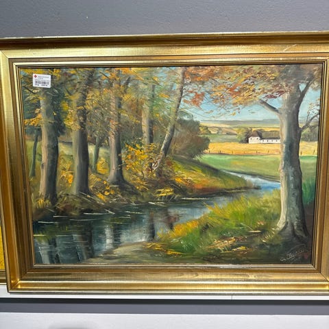 Dette er et maleri indrammet med en gylden ramme. Oliemaleri forestillende gård med omliggende marker etc ,Afhentes i:,Røde Kors Virum (173),Bemærk at mail, chat og beskeder ikke besvares, og varen skal købes på knappen "Gå til varen"
