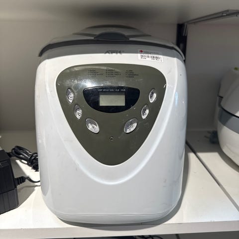 Produktet er en brødmaskine med en metalbeholder og en sort plastikhætte. Den har en digital skærm og betjeningsknapper.,Afhentes i:,Røde Kors Kolding (621),Bemærk at mail, chat og beskeder ikke besvares, og varen skal købes på knappen "Gå til varen"