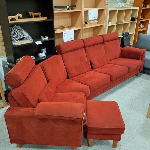 Sofaen har buede armlæn og et blomstermønster i det polstrede stof. Den har en dekorativ skruekant. Sofaen har grønlige farver og er en 3-4 personers. ,Afhentes i:,Røde Kors Bellinge (461),Bemærk at mail, chat og beskeder ikke besvares, og varen skal købes på knappen "Gå til varen"