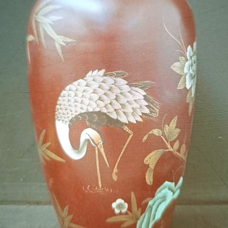 Meiji-æra bronsepatineret dekorativ vase fra Japan med fuglerelief, 46 × 24 cm, vægt ca. 6 kg, i fremragende stand fra privat samling, dateret omkring 1920. Klik på den blå "gå til varen" knap, for at købe eller byde på denne vare. Den samlede pris vil blive vist inden du afgiver dit bud.