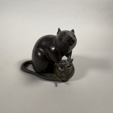 Et metalk okimono fra Japan fra Showa-perioden, Hotei står med en lang knyttet stav bagved, 27 cm høj, 19 cm bred, 12 cm dyb, brun patina, i meget godt stand, med tomobako og ægtecertifikat. Klik på den blå "gå til varen" knap, for at købe eller byde på denne vare. Den samlede pris vil blive vist inden du afgiver dit bud.